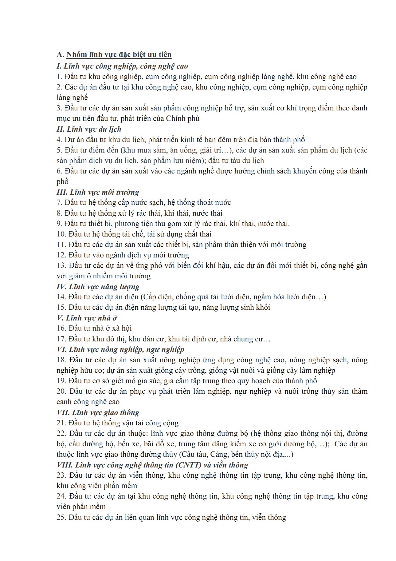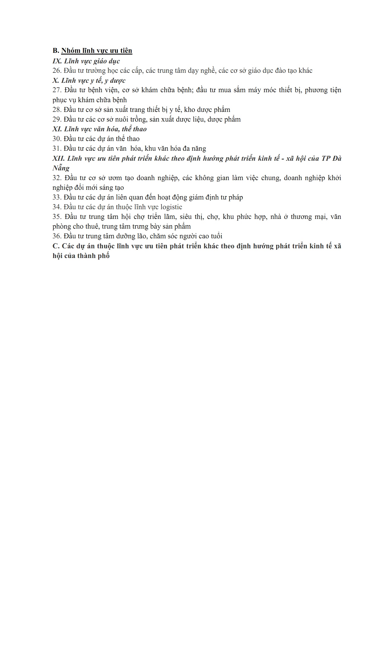 – Nhóm lĩnh vực ưu tiên gồm 4 lĩnh vực: giáo dục; y tế, y dược; văn hóa, thể thao; các lĩnh vực ưu tiên khác như: đầu tư cơ sở ươm tạo doanh nghiệp, doanh nghiệp đổi mới sáng tạo; các dự án liên quan đến hoạt động giám định tư pháp; các dự án thuộc lĩnh vực logistic; các dự án trung tâm hội chợ triển lãm, siêu thị, chợ, khu phức hợp, nhà ở thương mại, văn phòng cho thuê, trung tâm trưng bày sản phẩm; trung tâm dưỡng lão, chăm sóc người cao tuổi.