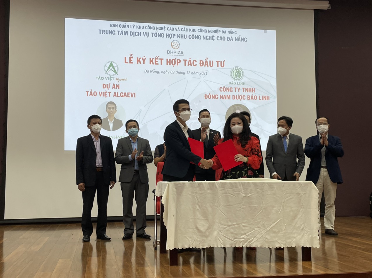 Nhận lời mời của Ban quản lý KCNC và các KCN Đà Nẵng, sáng ngày 09/12/2021 tại Hội trường tầng 4, Tòa nhà Ban quản lý KCNC & các KCN, lô A17, đường Trung tâm, Khu Công nghệ cao, ông Nguyễn Văn Vinh – Phó Giám đốc Quỹ Đầu tư phát triển đã đại diện Quỹ Đầu tư phát triển thành phố Đà Nẵng tham dự Hội thảo ký kết đầu tư và trao chứng nhận tốt nghiệp cho 03 dự án ươm tạo doanh nghiệp công nghệ cao tuyển chọn năm 2020, gồm: Dự án Ứng dụng trợ lý ảo giao thông Caris; Dự án Tảo Việt AlgaeVi -Ứng dụng công nghệ cao trong sản xuất tảo Xoắn; Dự án Vi sinh Xứ Tiên – Phân lập, nuôi cấy nhóm vi sinh vật bản địa ứng dụng trong sản xuất và cải tạo đất trồng và lễ kí kết hợp tác đầu tư giữa Công ty TNHH Đông Nam Dược Bảo Linh và Dự án Tảo Việt AlgeaVi.