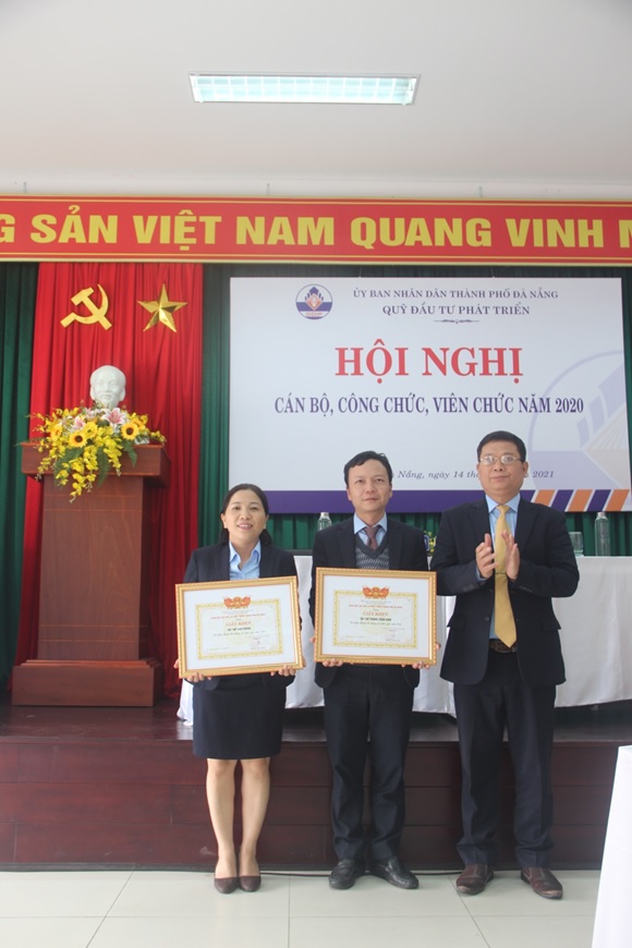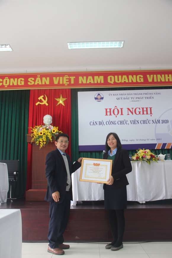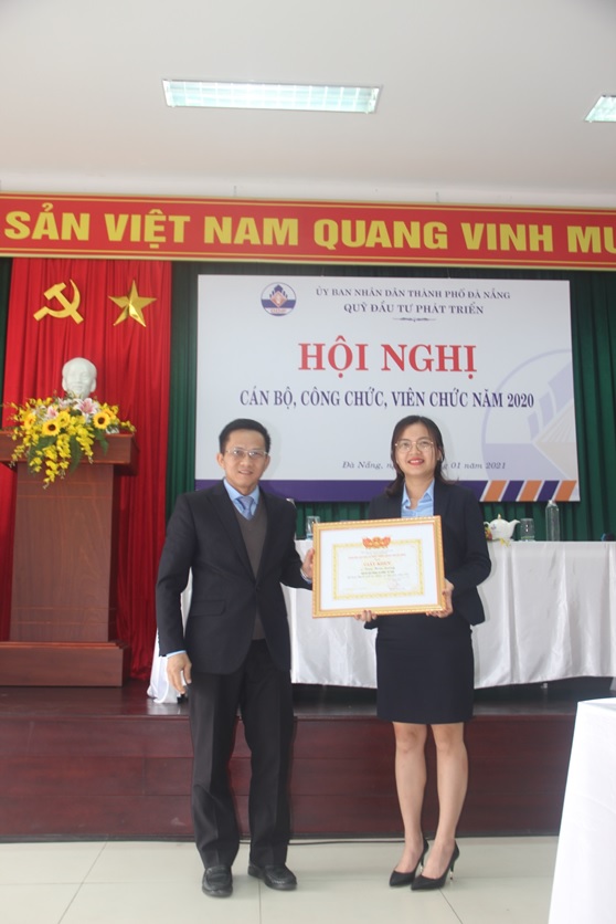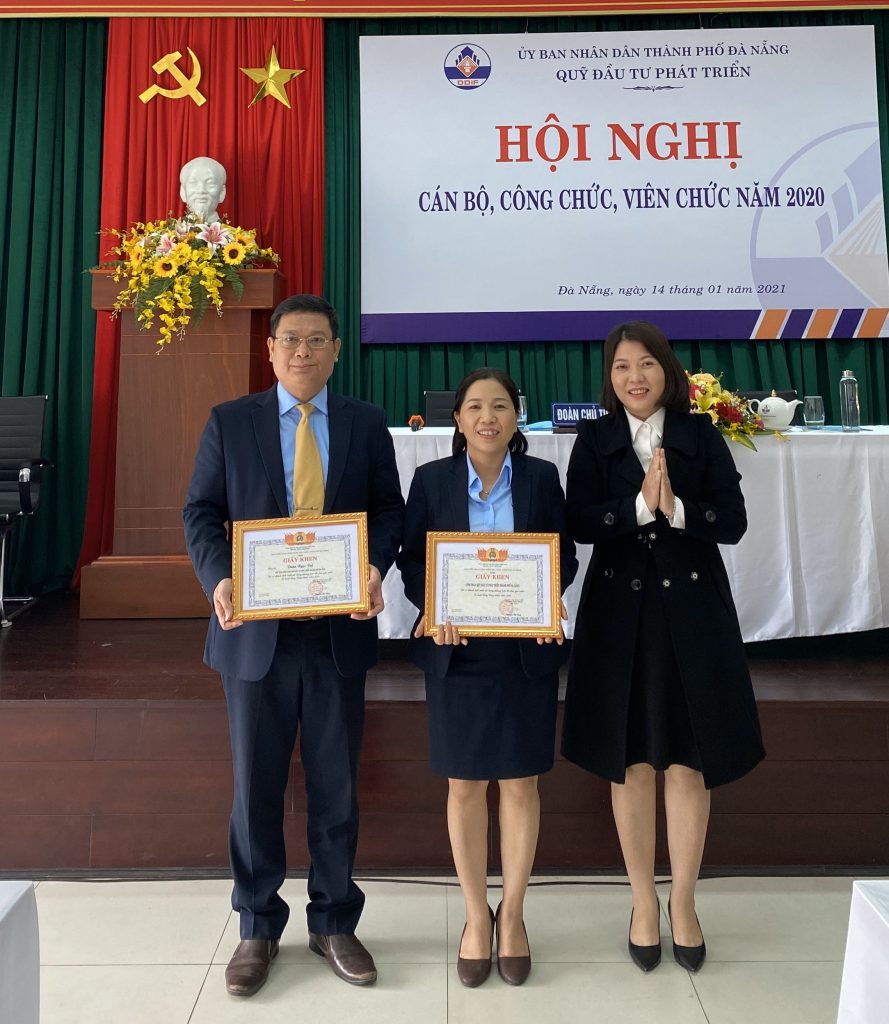 Ảnh: Bà Nguyễn Thị Dung – Chủ tịch Công đoàn Viên chức TPĐN trao Giấy khen cho cá nhân Ông Đoàn Ngọc Vui – Chủ tịch Công đoàn và tập thể Công đoàn Quỹ Đầu tư phát triển TPĐN
