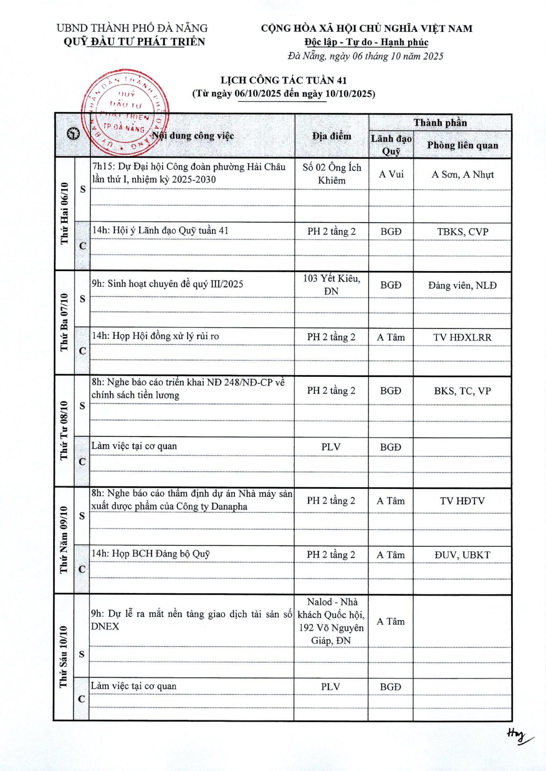 Lịch công tác tuần 41
