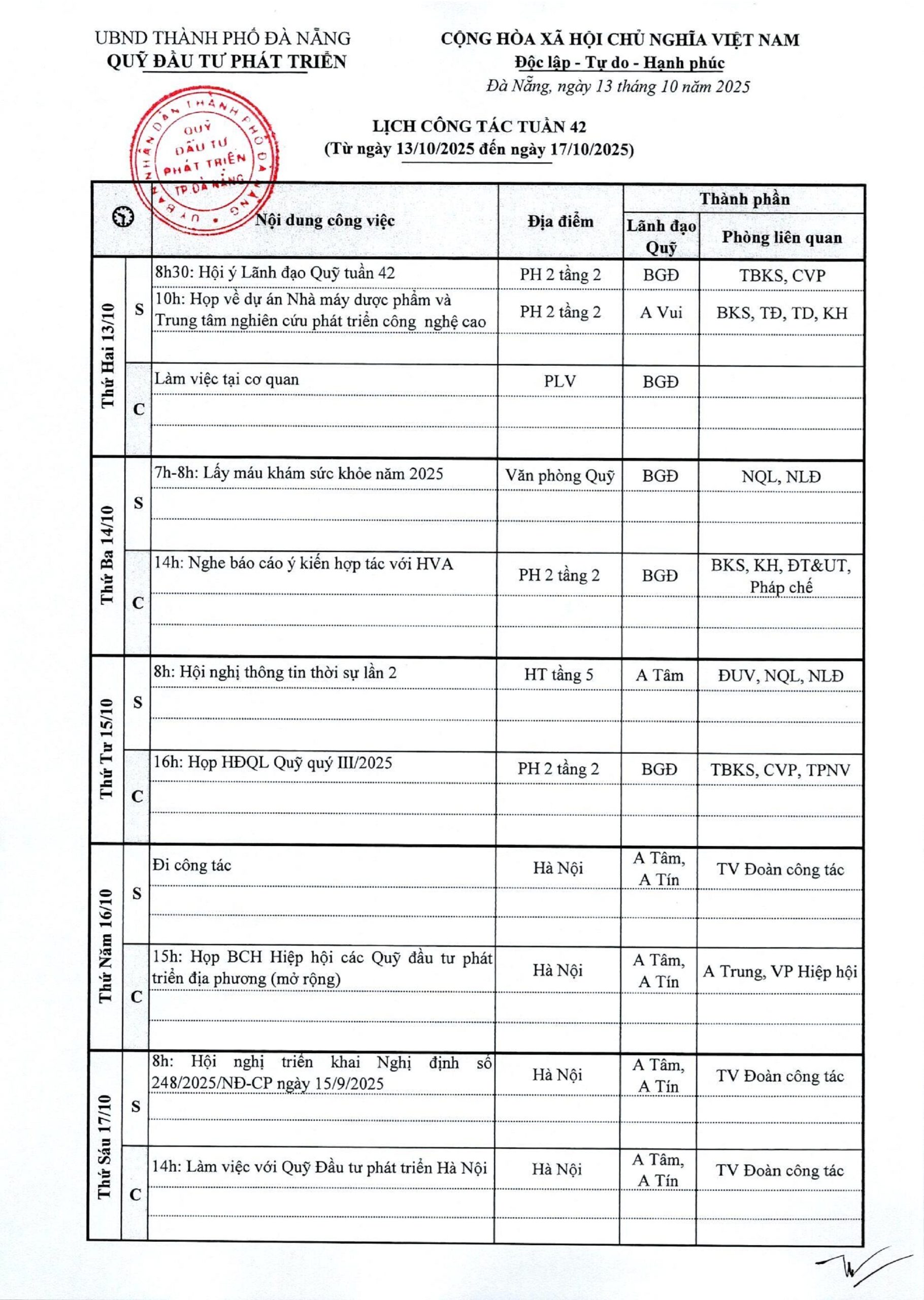 Lịch công tác tuần 42