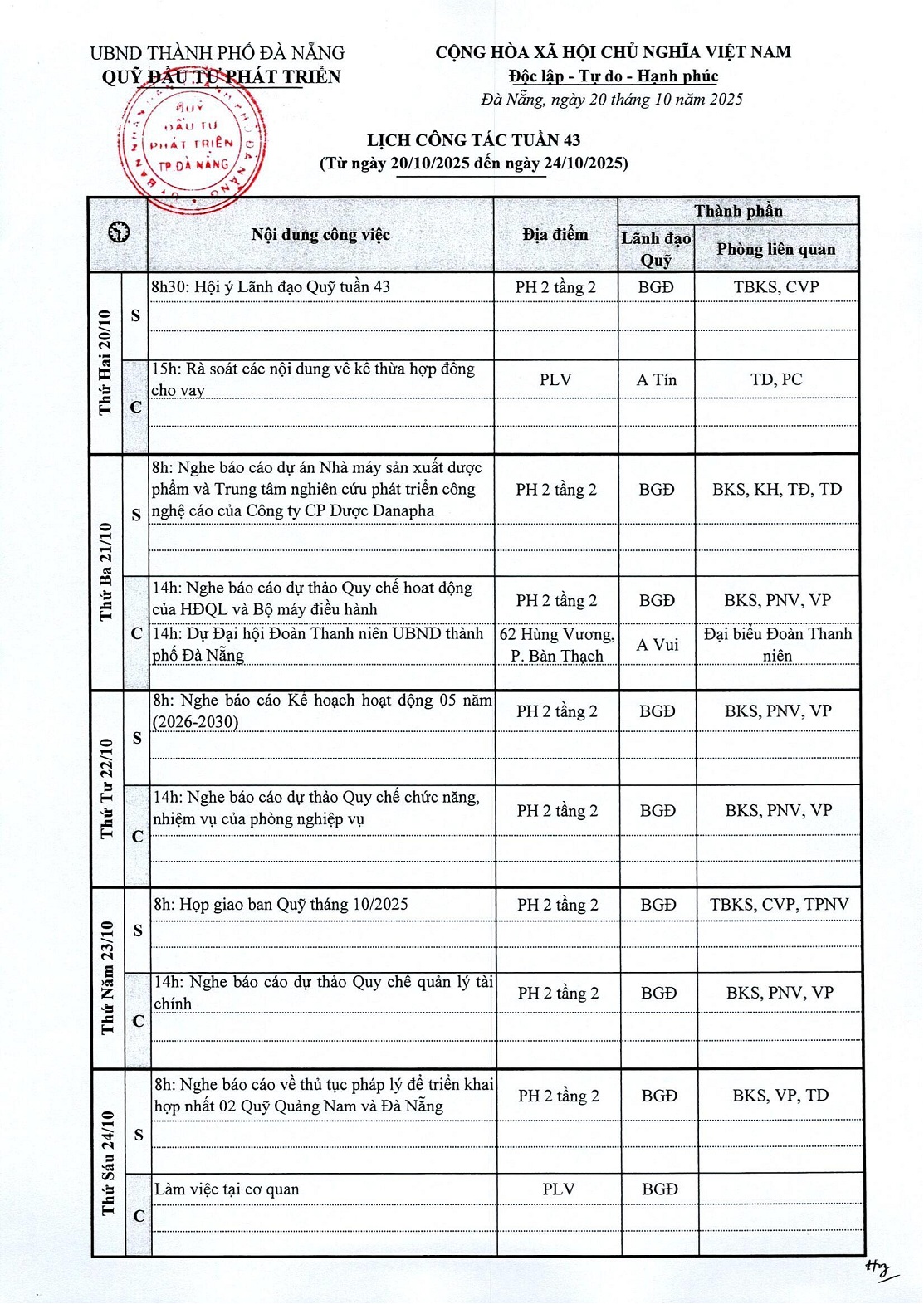 Lịch công tác tuần 43