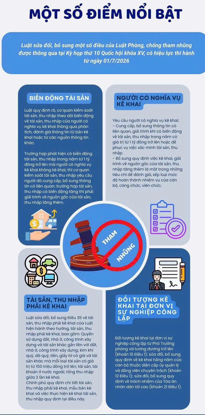Ngày 01/07/2026, Luật số 132/2025/QH15 sửa đổi, bổ sung một số điều của Luật Phòng, chống tham nhũng chính thức có hiệu lực, trong đó có nhiều nội dung mới đáng chú ý, như: Làm rõ thẩm quyền, trách nhiệm của hệ thống các cơ quan kiểm soát tài sản, thu nhập; điều chỉnh biên độ giá trị tài sản, thu nhập phải kê khai; quy định chặt chẽ hơn về trách nhiệm giải trình; hoàn thiện thẩm quyền và trách nhiệm của các cơ quan trong phòng ngừa, phát hiện và xử lý tham nhũng…