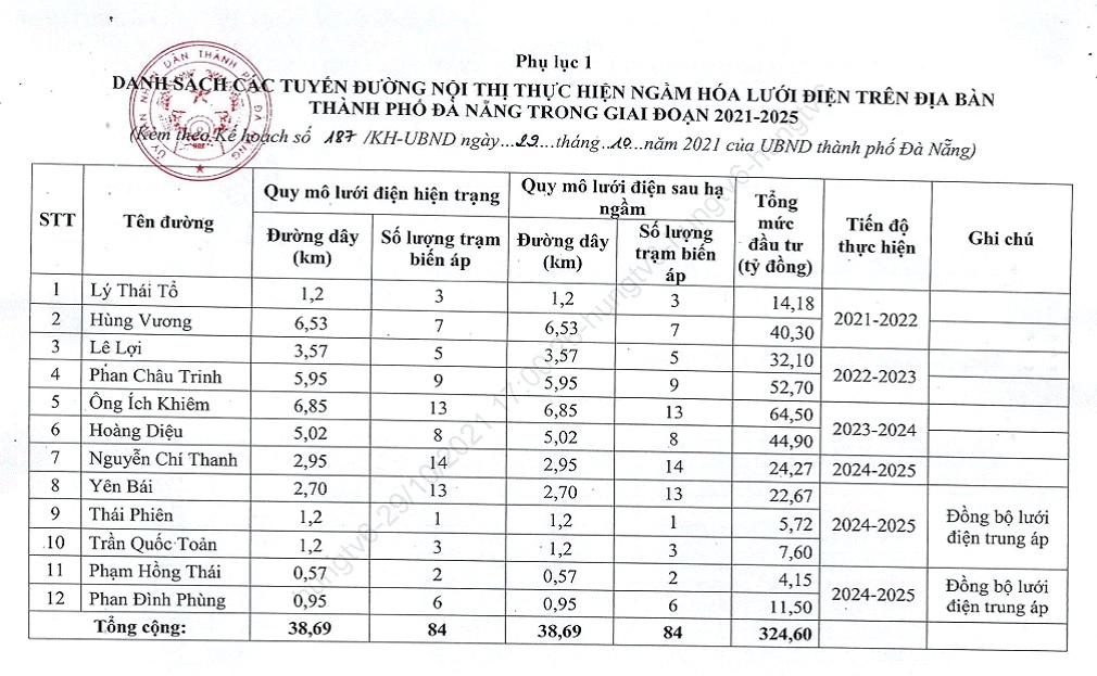 Đối với 04 tuyến đường: Lê Lợi, Phan Châu Trinh, Ông Ích Khiêm, Hoàng Diệu sẽ thực hiện ngầm hóa lưới điện hiện hữu trong giai đoạn 2022-2024 nhưng thực hiện phân kỳ đầu tư, trong đó thực hiện hoàn thành thi công lắp đặt ống để luồn cáp ngầm theo tiến độ cải tạo hệ thống thoát nước và hạ tầng cống bể ngầm thông tin dự kiến hoàn thành trong năm 2022 theo chỉ đạo của UBND thành phố.”
